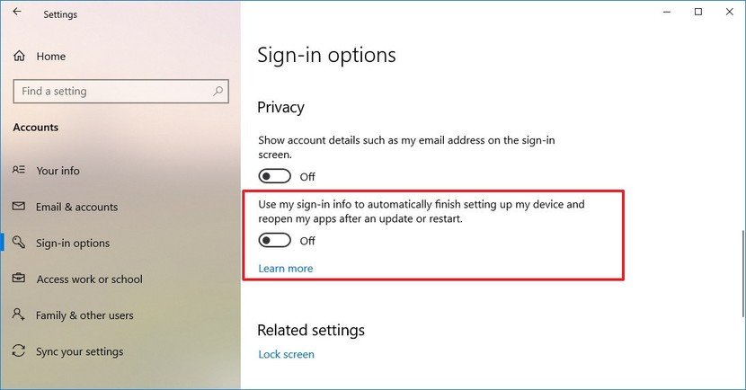 Under the „Privacy“ section, turn off the Use my sign-in info to automatically finish setting up my device and reopen my apps after an upgrade or restart option.