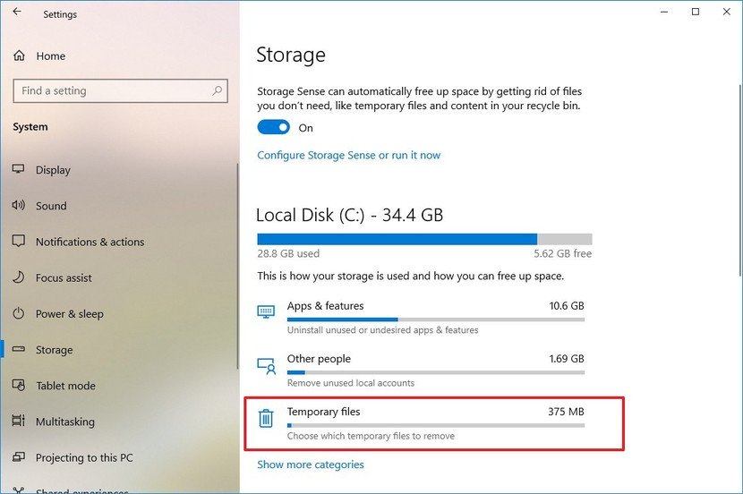 Under the „Local Disk“ section, click the Temporary files item. (If you don’t see the option, click the Show more categories link.)