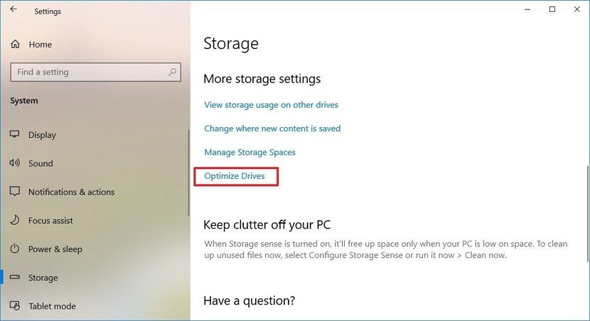 Under the „More storage settings“ section, click the Optimize Drives option.