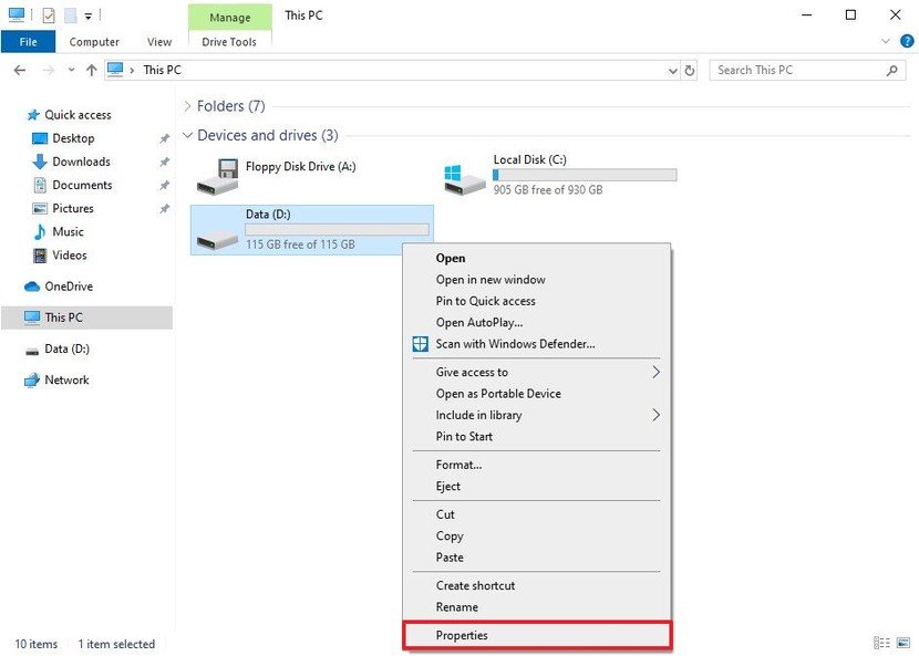 Under the „Devices and drives“ section, right-click the USB flash drive, and select the Properties options.