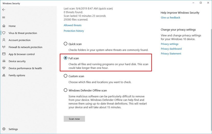 After you complete the steps, Windows Defender Antivirus should be able to detect and delete any malware impacting performance.