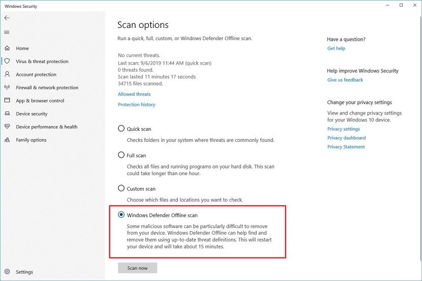 In the case that Windows Defender Antivirus doesn’t start, isn’t able to update its definition, or has problems completing the scan, chances are that your computer is infected with an aggressive malware. In this case, try to use the offline scan feature to remove it: