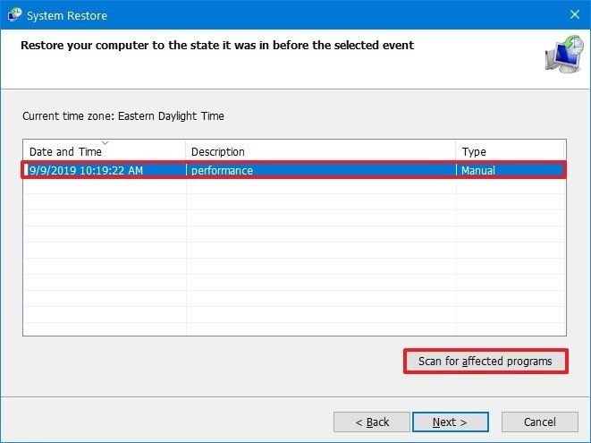 Click the Scan for affected programs button to see the applications that will be removed if they’re installed after the restore point was created.