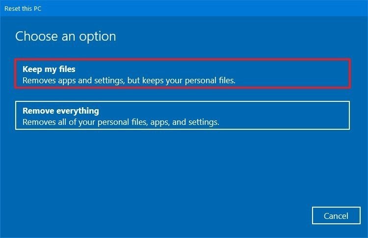Click the Keep my files button. (You can also click the Remove everything button to erase everything and install a clean copy of Windows 10.)