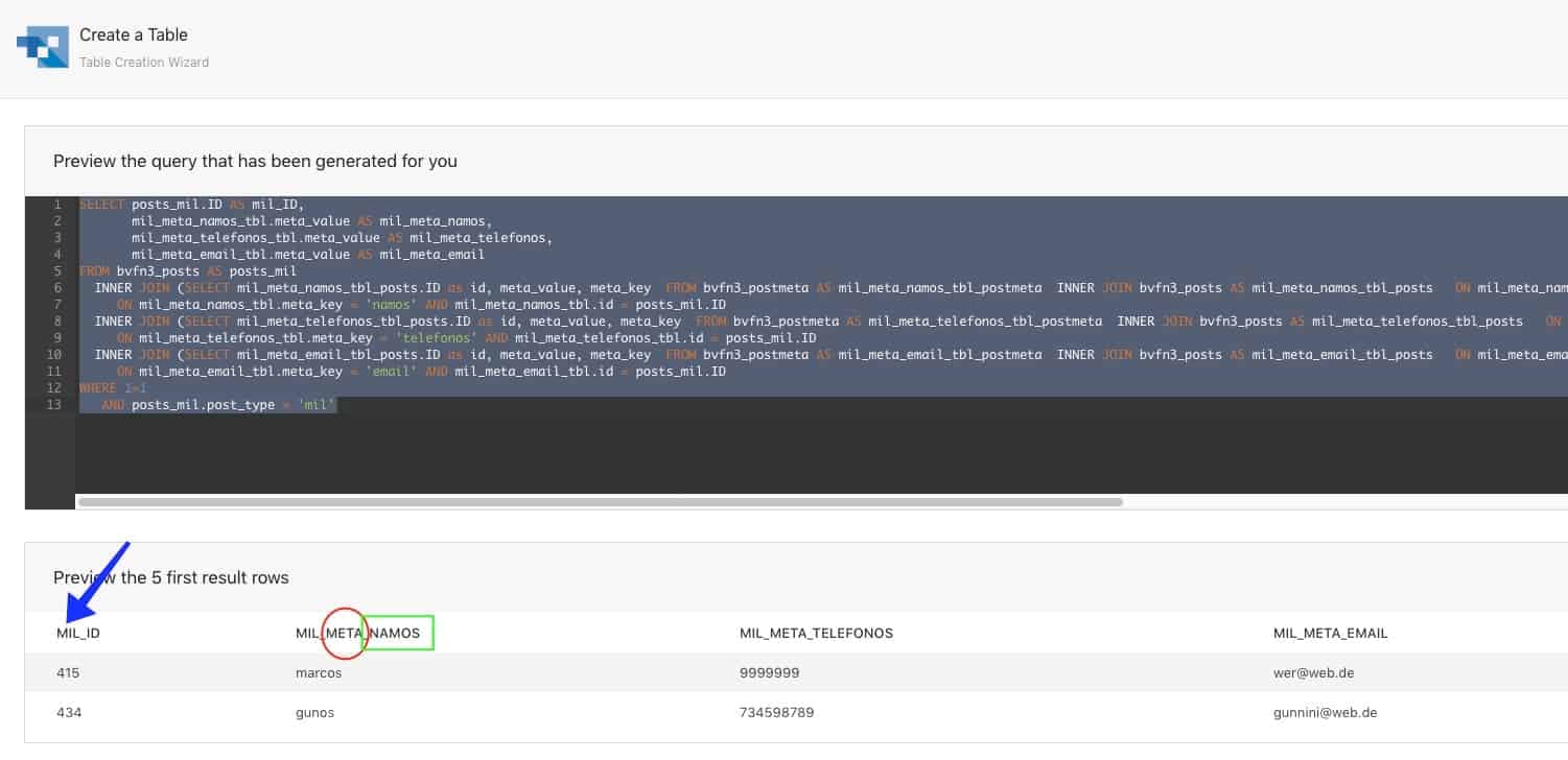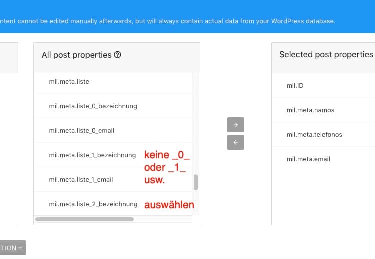 Über das CFDB-Plugin die Spalten auswählen und einen Shortcode erstellen.