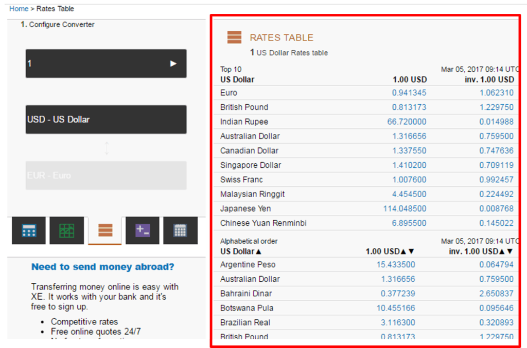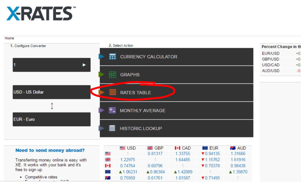 Eine solche Webseite ist z.B. x-rates.com, auf der unter dem Link „Rates Table“ die wichtigsten aktuellen Wechselkurse in Tabellenform zur Verfügung gestellt werden.