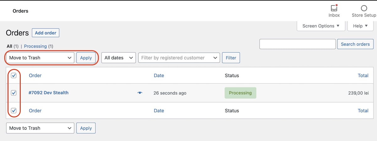 Aktionen auswählen: Über der Bestellliste befindet sich ein Dropdown-Menü. Wählen Sie hier „In den Papierkorb verschieben“.