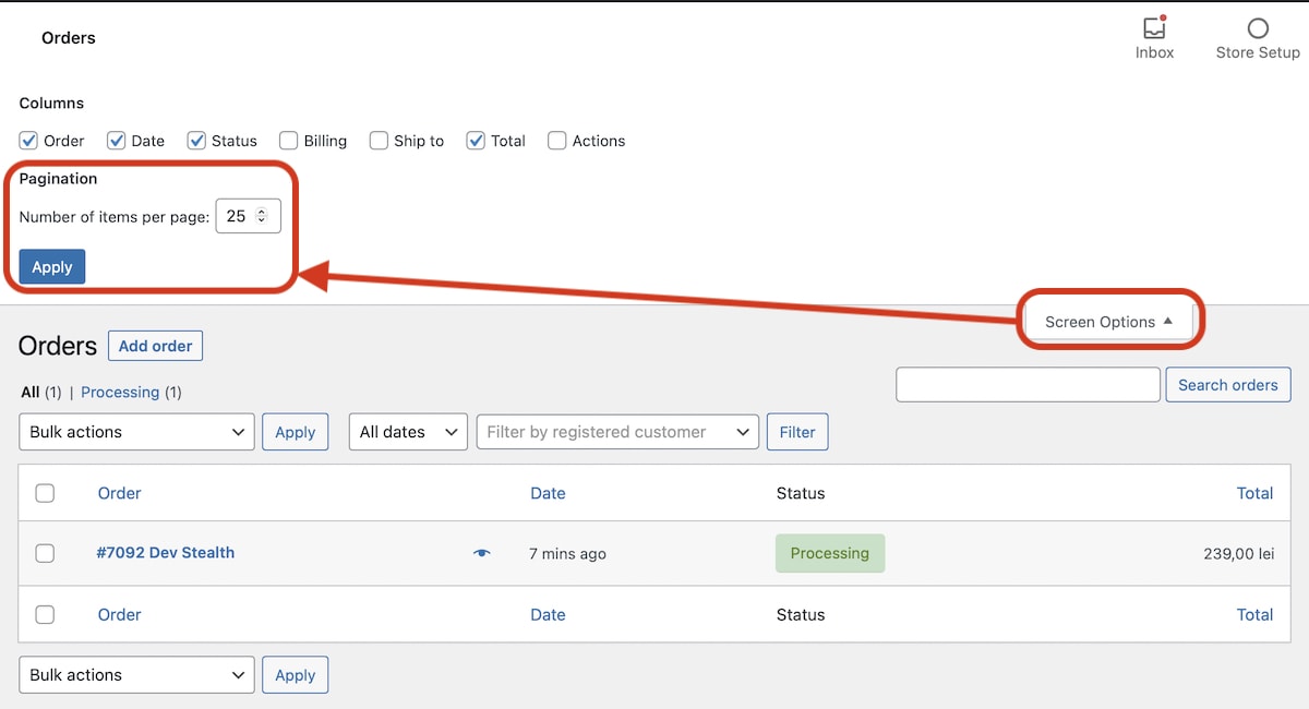 In „Ansicht anpassen“ können wir eine größere Anzahl von Bestellungen auf der Seite auflisten. Der Default-Wert WooCommerce listet 25 Bestellungen auf.