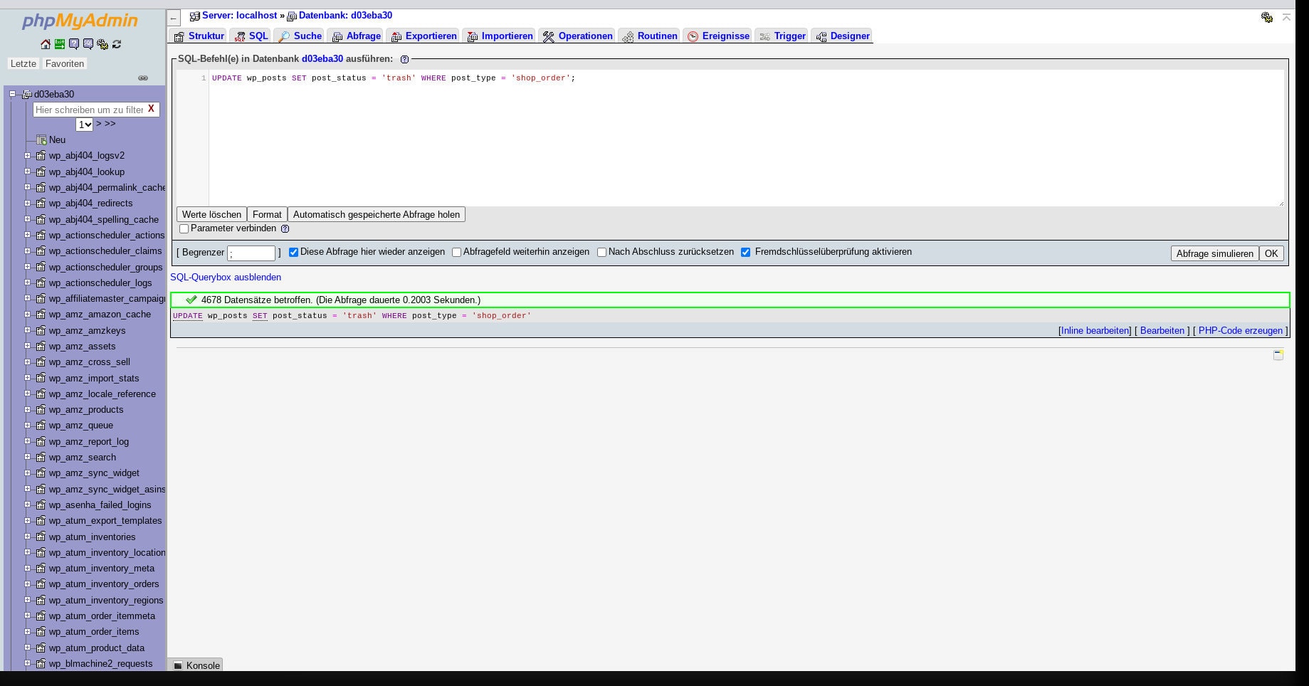 update wp_posts set post_status = 'trash' where post_type = 'shop_order';4347 Zeilen betroffen. (Abfrage dauerte 0.2114 Sekunden.)