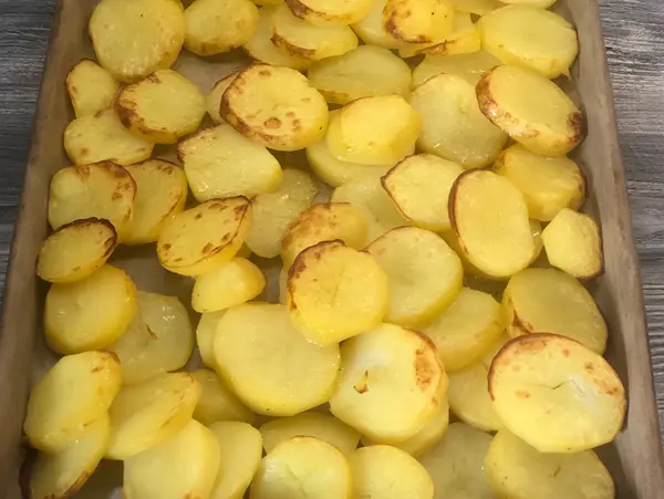 Blech aus dem Backofen nehmen, Kartoffeln erneut vorsichtig wenden.