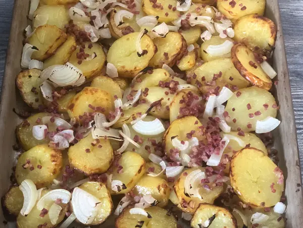 Die Zwiebeln und Schinkenwürfel auf die Kartoffeln geben und ohne zu mischen wieder zurück in den Backofen geben.