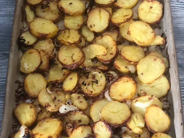 Aus dem Backofen holen und mit einem Pfannenwender die Kartoffeln vorsichtig wenden.