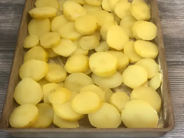 Pellkartoffeln am Vortag kochen. Am nächsten Tag pellen und die Kartoffeln in ca. 0,5 cm dicke Scheiben schneiden.