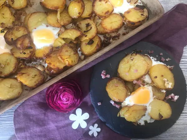 Die Zwiebeln und Schinkenwürfel auf die Kartoffeln geben und ohne zu mischen wieder zurück in den Backofen geben.