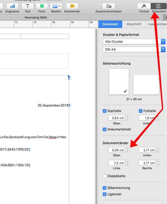 Darstellung –> Infofenster –> Dokumentkonfiguration.Jetzt kann man in der Seitenleiste die Dokumentränder nach belieben einstellen und verschieben.