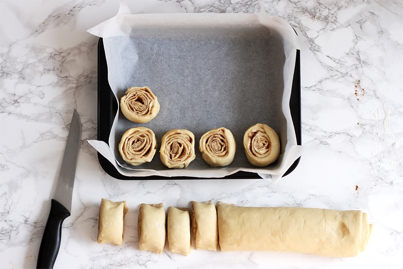 Die Rolle in rund 3 cm breite Stücke schneiden. Die Cinnamon Rolls mit etwas Abstand zueinander in eine mit Backpapier ausgelegte oder geölte Form (ca. 28 x 32 cm) legen. Anmerkung: Die hier verwendete Form ist kleiner und misst 20 x 24 cm. Ich habe 12 Schnecken in diese Form bekommen und zusätzliche 3 Cinnamon Rolls in einer eigenen Kastenform gebacken.