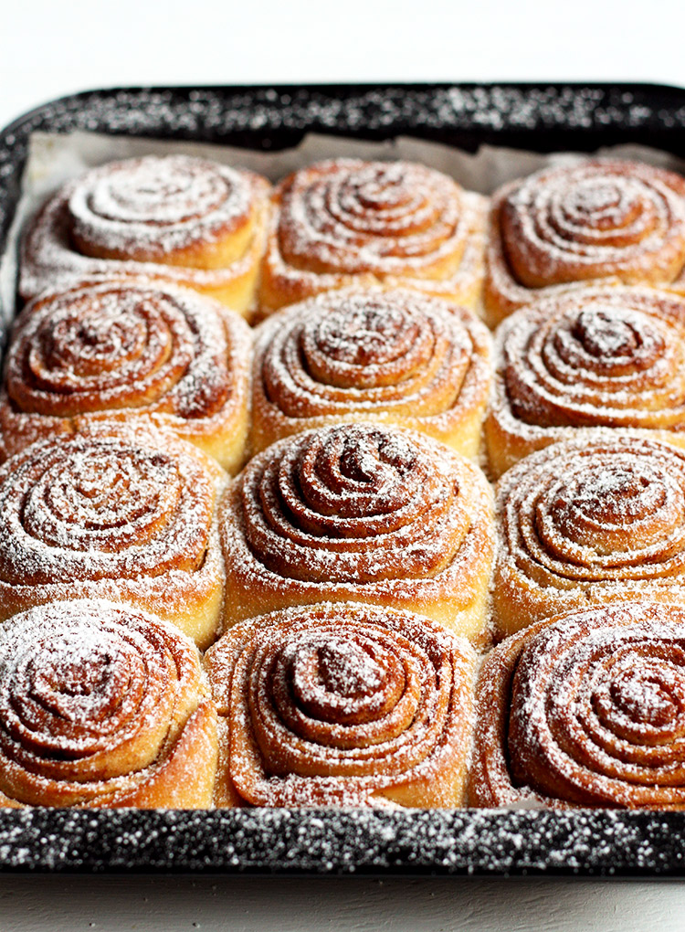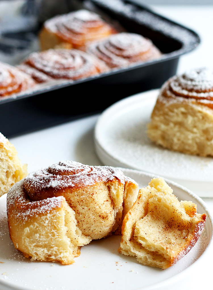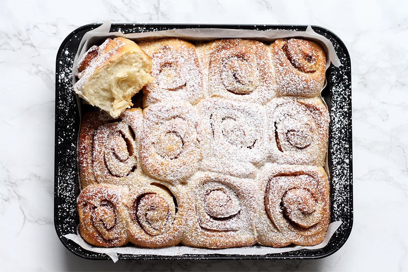 Rezept für große, luftige Cinnamon Rolls mit dezenter Süße. Man kann sie sofort backen oder erst am nächsten Tag zum Frühstück (siehe Tipp unten). Ich bestreue diese Zimtschnecken nur mit Staubzucker.