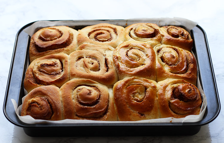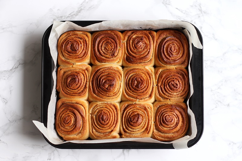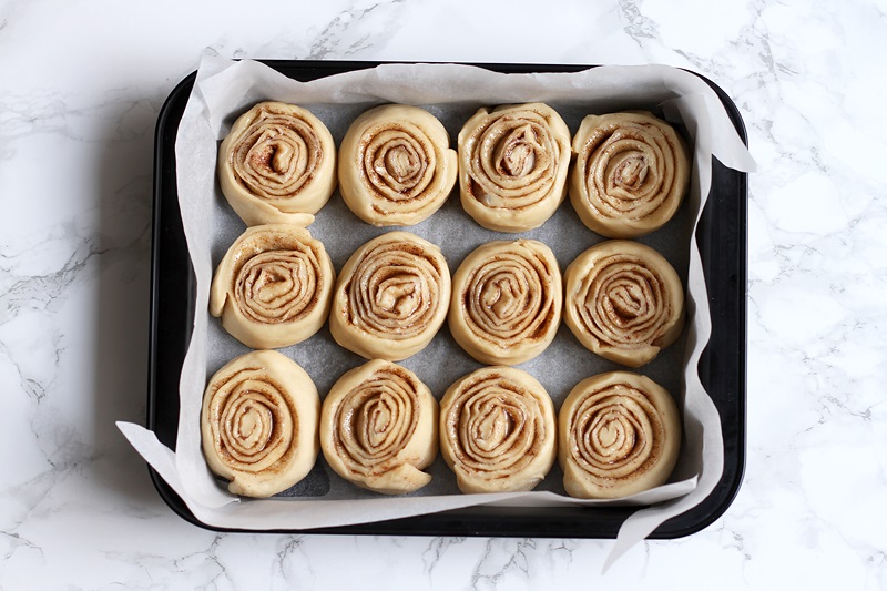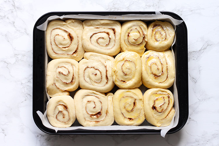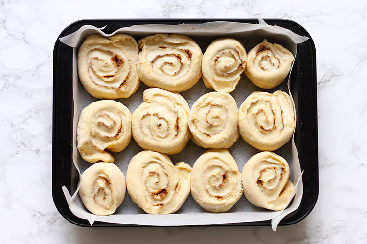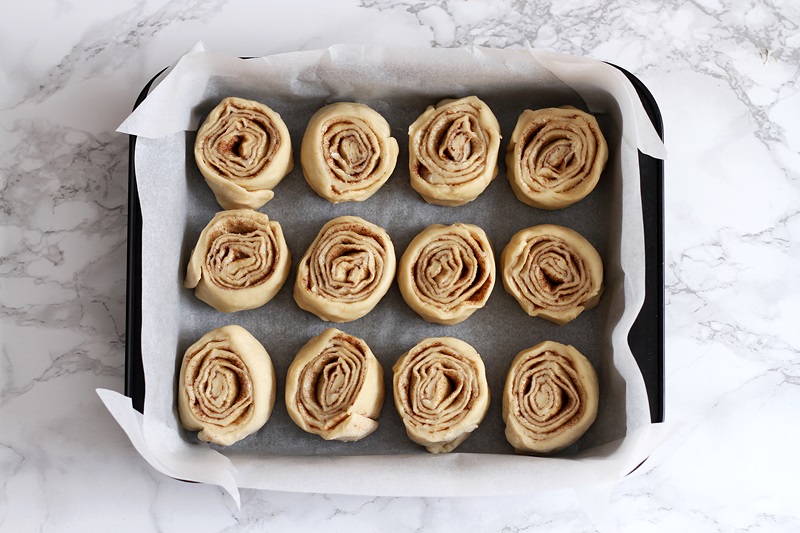 • Die Cinnamon Rolls mit etwas Abstand zueinander in eine mit Backpapier ausgelegte oder geölte Form (ca. 23 x 33 cm) legen. Anmerkung: Man kann auch eine große Springform verwenden und falls nicht alle Zimtschnecken Platz haben, die restlichen in einer Kastenform backen.