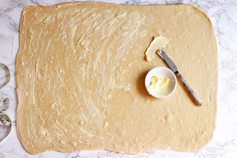 Den Teig mit weicher Butter bestreichen. Wenn die Butter nicht sehr weich ist, gestaltet sich das übrigens schwierig, diese daher rechtzeitig aus dem Kühlschrank nehmen.