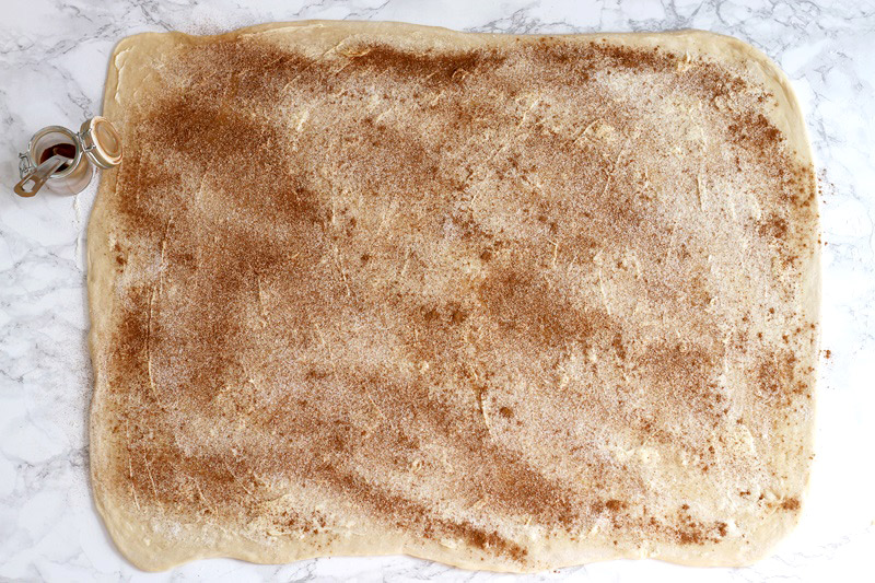 Zucker und Zimt vermengen und den Teig damit bestreuen. Im Bild oben habe ich den Teig zuerst mit Zucker, anschließend mit Zimt bestreut. Das Zimt verteilt sich aber am gleichmäßigsten, wenn man Zucker und Zimt vorher gründlich vermengt.