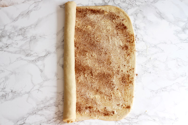 Zimtschnecken mit dünn ausgerolltem Teig.