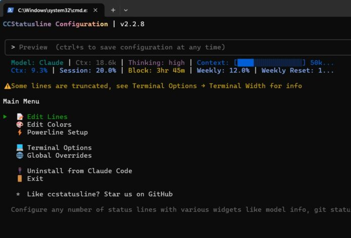Nach dem Ausführen öffnet sich ein Konfigurationsmenü. Hier kannst du das Design anpassen. Wichtig ist, dass die Option für den Kontext-Verbrauch aktiviert ist.