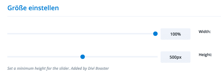 Der einfachste und bequemste Weg geht über das von uns bereits getestete hilfreiche Plugin Divi Booster. Unter anderem bietet das Plugin eine Option zum Anpassen der Sliderhöhe an. Nach Installation und Aktivierung des Divi Booster Plugins, findet sich in den Einstellungen des Slider Moduls unter „Design“ im Bereich „Größe einstellen“ eine neue Option zum Einstellen einer minimalen Höhe für das jeweilige Slider Modul: