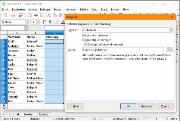 Zurück im Tabellenblatt mit den Namen markieren Sie die Spalte, in der Sie künftig aus den vorhin festgelegten Werten auswählen wollen. Gehen Sie zu Data/Gültigkeitund wählen Sie bei Zulassen den Eintrag Zellbereich. Setzen Sie den Cursor ins Feld «Quelle» und klicken Sie dahinter aufs Icon für die Zellauswahl. Das Fenster verkleinert sich. So können Sie ins Blatt mit den Abteilungen wechseln. Markieren Sie dort die Zellen mit den Abteilungsnamen – Calc übernimmt den Zellbereich gleich ins Feld «Quelle». Im Reiter Fehlermeldung könnten Sie übrigens eine Meldung eintippen, die erscheint, wenn jemand versucht, etwas Falsches in der Abteilungsspalte einzutippen. Sitzt alles, drücken Sie Enter.