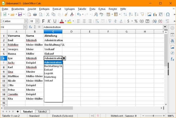 Vorbereitung: In einem separaten Blatt Ihrer Calc-Datei listen Sie die Elemente (z.B. Abteilungen) auf. Sortieren Sie diese manuell oder automatisch gleich in der Reihenfolge, die Sie später im Drop-down-Menü haben wollen, zum Beispiel alphabetisch.