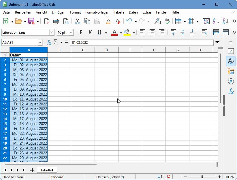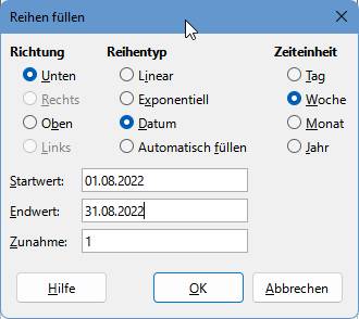 Der Eintrag Woche müsste eigentlich Wochentage heißen. Und anders als gedacht, verwendet Calc damit tatsächlich die Wochentage (Montag bis Freitag). Geben Sie das Enddatum ein (z. B. 31.08.22) und klicken Sie auf OK.