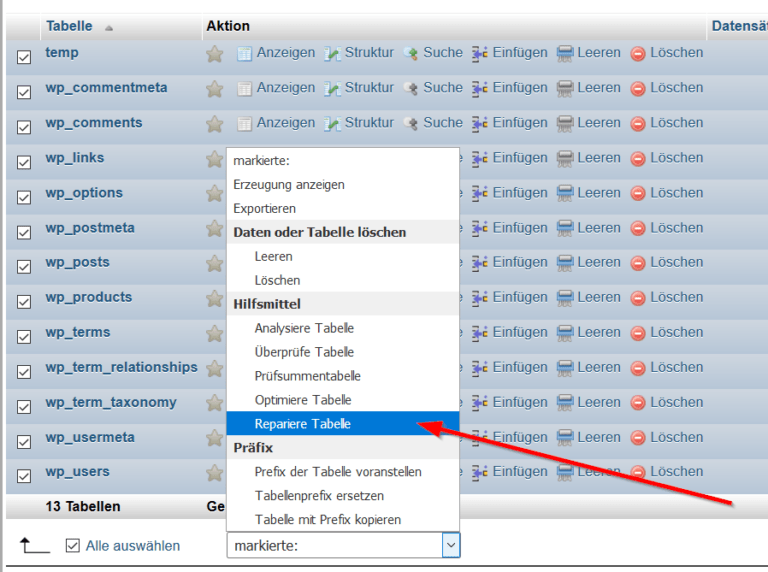 Wenn Du Dich mit Datenbanken und MySQL etwas auskennst, kannst Du beschädigte Datenbanktabellen mit dem MySQL Befehl „REPAIR Tabellenname“ reparieren („Tabellenname“ muss natürlich durch die jeweilige Tabelle ersetzt werden). Dies muss für jede Tabelle einzeln erfolgen. Mit dem Datenbankmanagement-Tool phpMyAdmin kannst Du auch alle Tabellen auswählen und diese dann reparieren.