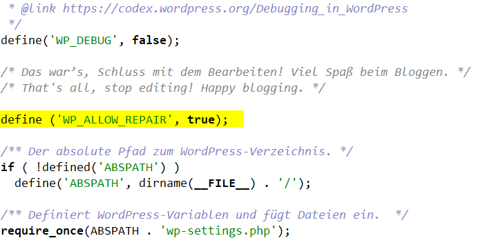 define(‚ABSPATH‘, dirname(__FILE__) . ‚/‘);„Zeile zum Einfügen:define (‚WP_ALLOW_REPAIR‘, true);