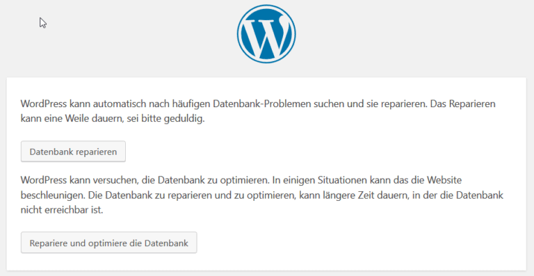 Natürlich musst Du vorher „deine-seite.de“ durch Deine Domain ändern. Jetzt solltest Du auf eine Oberfläche gelangen, die so aussieht: - Klicke jetzt auf „Datenbank reparieren„. Alternativ kannst Du auch auf „Repariere und optimiere die Datenbank“ klicken. Dann werden zusätzlich Deine Tabellen aus Performance-Sicht optimiert. WordPress wird Dir zum Abschluss jetzt einen Statusreport ausgeben:
