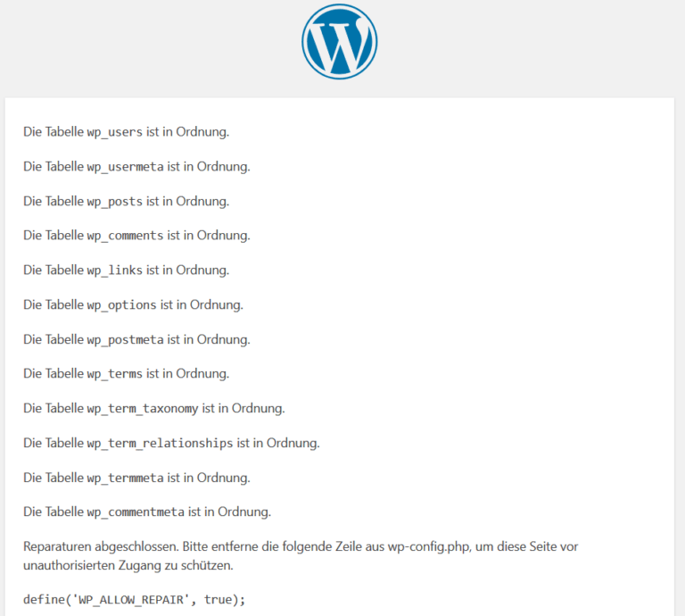 - Deine Datenbanktabellen wurden jetzt repariert. Vergiss zum Abschluss nicht die Zeile „define(‚WP_ALLOW_REPAIR‘, true);“ aus der wp-config.php wieder zu löschen.