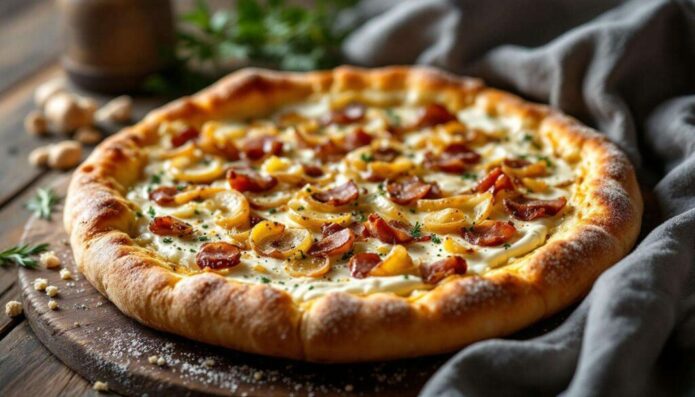 Die Speckwürfel gleichmäßig über die Crème verteilen. Darüber die vorbereiteten Zwiebelringe legen. Nicht zu viele Zwiebeln verwenden, damit der Flammkuchen nicht zu feucht wird. Ein Esslöffel Olivenöl kann leicht über den Belag geträufelt werden, um zusätzliche Röstaromen zu erzeugen.