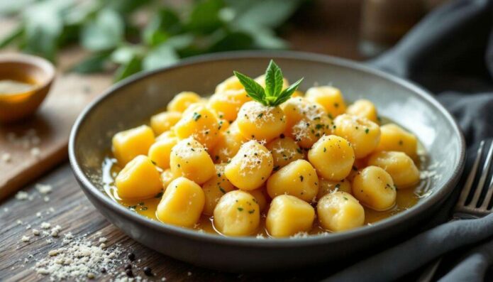 Nimm die Pfanne vom Herd und streue den geriebenen Parmesan über die Gnocchi. Rühre den Käse vorsichtig unter, sodass er leicht schmilzt und eine cremige Konsistenz entsteht. Der Parmesan bindet die Butter zusätzlich und verleiht dem Gericht einen intensiven, würzigen Geschmack. Serviere die Gnocchi-Pfanne sofort, solange sie noch heiß ist und der Käse perfekt geschmolzen ist.