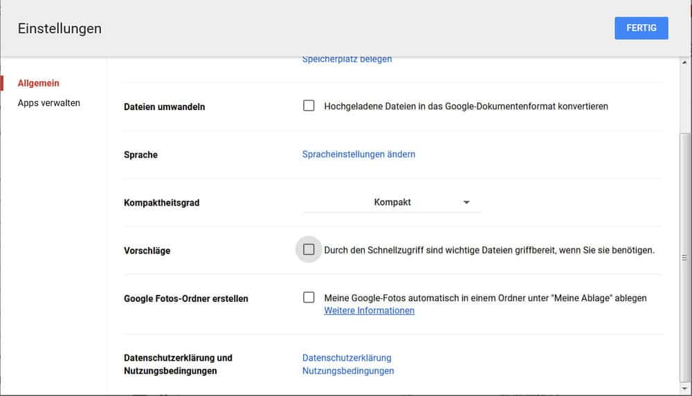 Blenden Sie den Schnellzugriff daher komplett aus: Öffnen Sie in Google Drive oben rechts das Zahnrad-Menü und besuchen Sie Einstellungen. Deaktivieren Sie die Hier die Option Vorschläge.