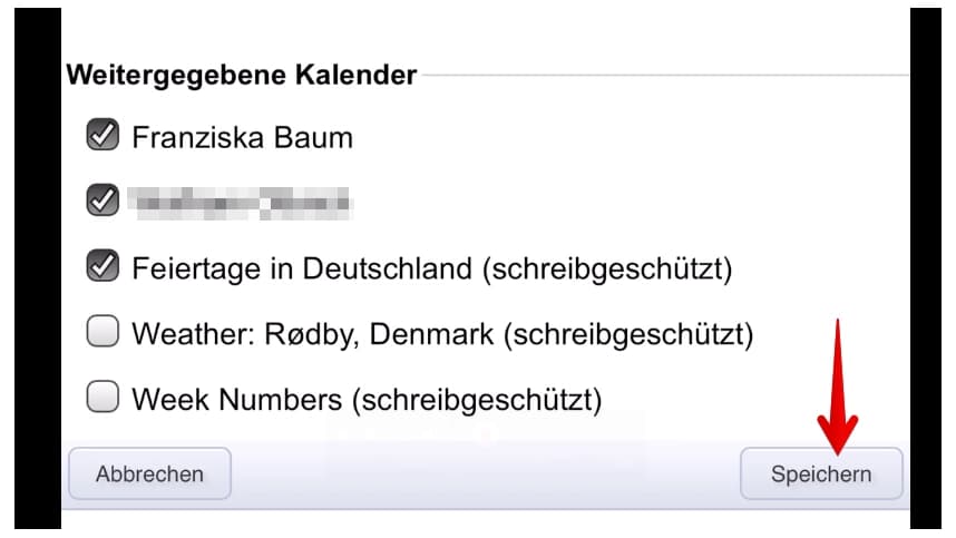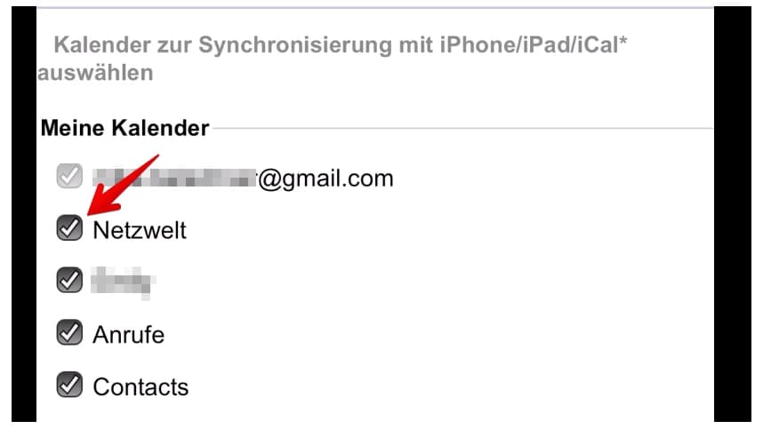 Aktiviert das Häkchen vor den angezeigten Kalendernamen, wenn diese mit eurem iPhone oder iPad synchronisiert werden sollen. Ist das Häkchen deaktiviert, habt ihr über die Kalender-App von iOS keinen Zugriff auf diese Termine.