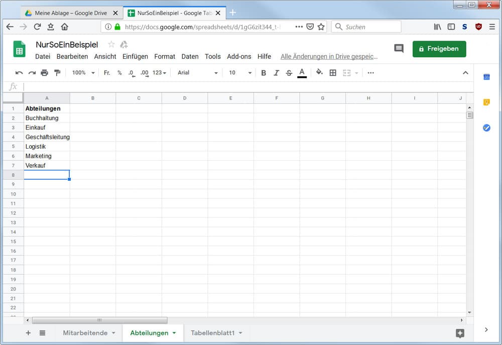 Öffnen Sie Ihre Tabelle in Google Docs, beispielsweise in Firefox oder Chrome. Erstellen Sie durch Klick aufs Plus-Zeichen neben den Tab-Reitern unterhalb der Tabelle ein leeres Tabellenblatt. Durch Ausklappen des Kontextmenüs übers kleine Dreieck können Sie das Blatt Umbenennen, zum Beispiel in «Abteilungen». Tippen Sie in der ersten Zelle den Titel Abteilungen ein (der ist nicht verpflichtend) und listen Sie darunter die gewünschten Werte auf. Denken Sie daran, alle zu erwischen.