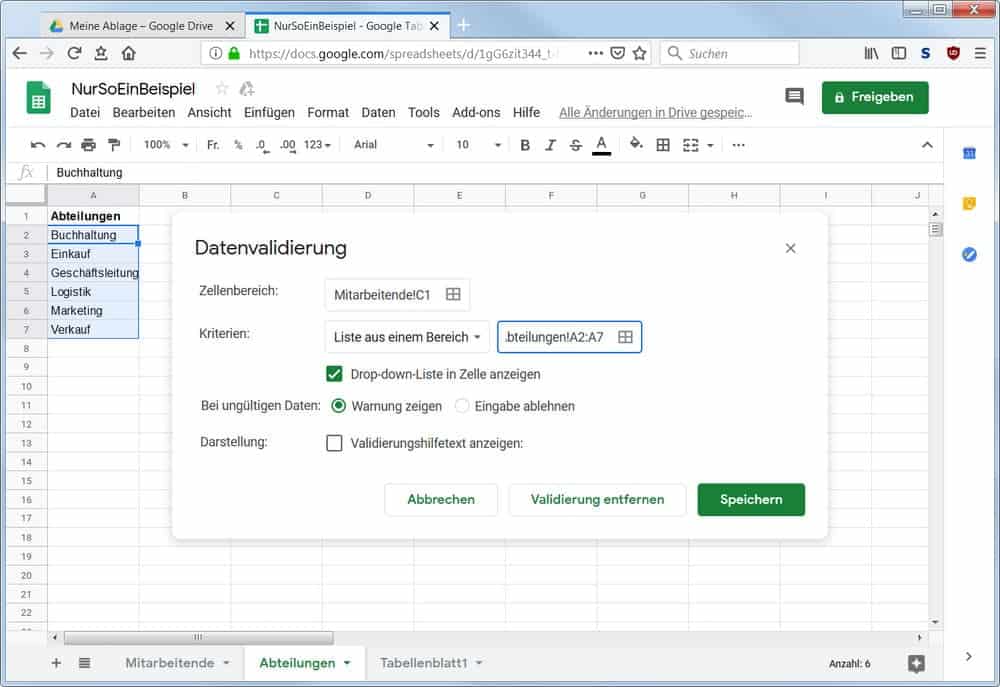 Was für Excel und LibreOffice beliebt ist, dürfte auch eine gefragte Funktion für Google Spreadsheets sein, sprich für die Tabellenanwendung in Google Drive bzw. Google Docs. Wir zeigen es am Beispiel einer Abteilungsauswahl für eine Mitarbeiterliste. Es funktioniert aber auch mit anderen wiederkehrenden Werten genauso.