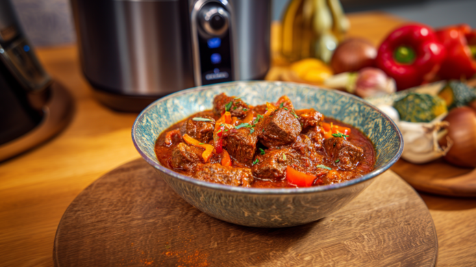 - Reduziere die Temperatur auf 160 °C und gare das Gulasch 30 Minuten. Rühre alle 10 Minuten um.