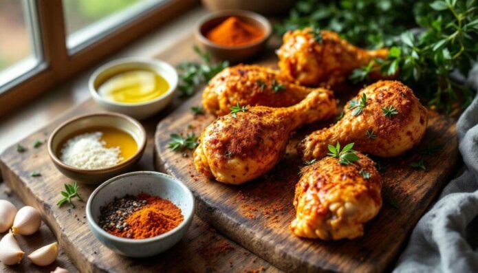 Während die schenkel ruhen, bereiten sie die gewürzmischung vor. Kombinieren sie in einer schüssel das olivenöl mit paprikapulver, knoblauchpulver, zwiebelpulver, geräuchertem paprikapulver, thymian und schwarzem pfeffer. Verrühren sie alles zu einer gleichmäßigen paste. Diese gewürzmischung verleiht den hähnchenschenkeln ein wunderbar aromatisches profil mit einer leicht rauchigen note.