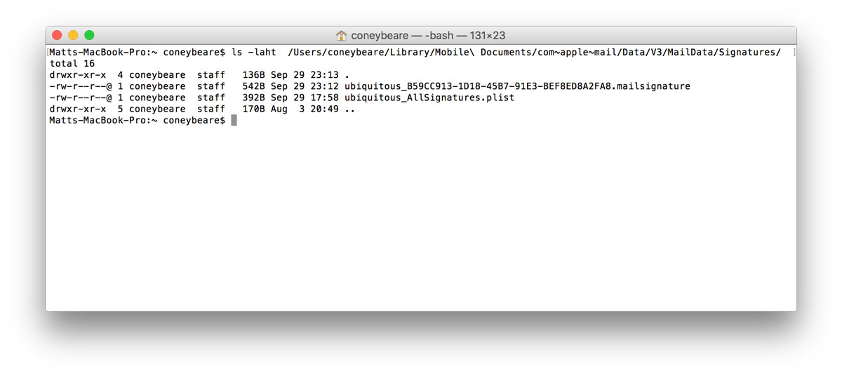 ls -laht ~/Library/Mail/V3/MailData/Signatures/ oderls -laht ~/Library/Mail/V4/MailData/Signatures/This line tells Terminal to list all the files in this directory along with some other file info, then sort it by date. When you press enter you should see a bunch of lines, each of which corresponds to a file and some of its metadata. Look at the right side column — the file names — and notice some that start with