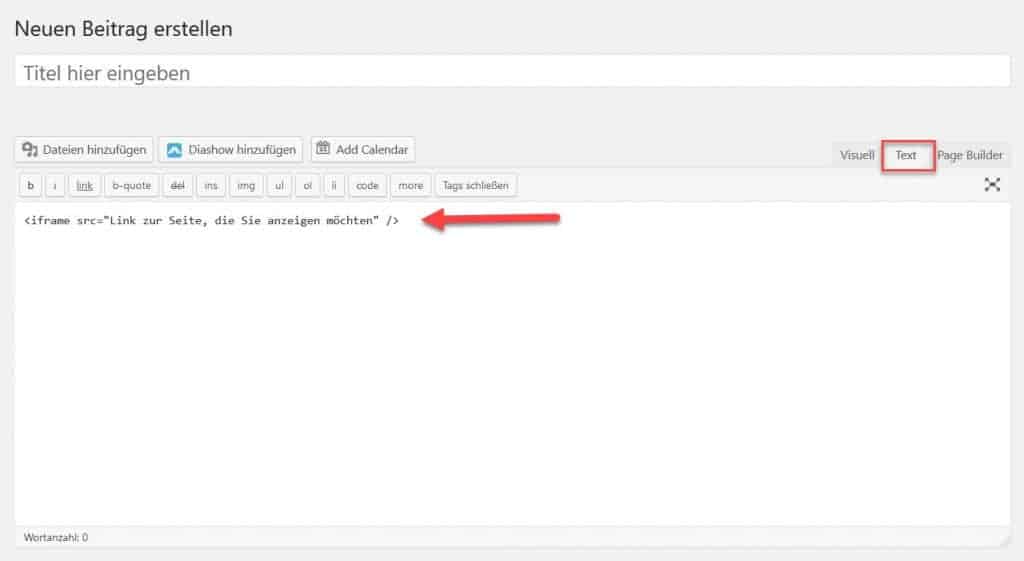 - In das Textfeld fügen Sie nun diesen Code ein: <iframe src=“Link zur Seite, die Sie anzeigen möchten“ />