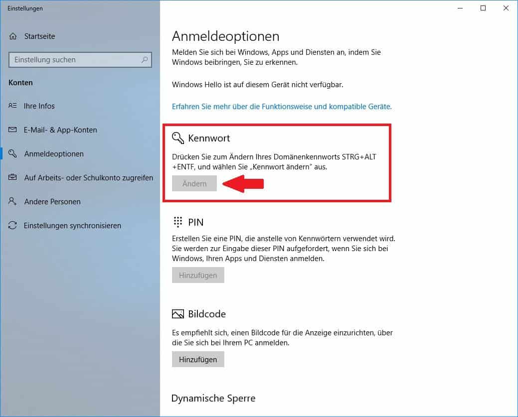 4. Klicken Sie rechts im Fenster unter der Überschrift “Kennwort“ auf “Ändern“