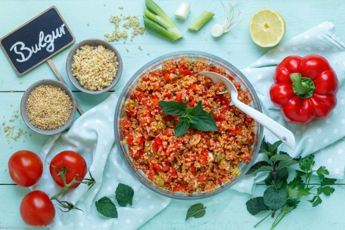 - Den Bulgur (kurz anrösten und anschließend) in eine große Schüssel geben und heißes Wasser (Gemüsebrühe) darüber geben, bis der Bulgur knapp bedeckt ist. Reichlich salzen und zehn Minuten quellen lassen.
