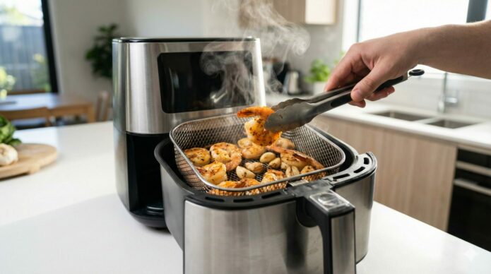 - Lege die marinierten Garnelen in den Airfryer-Korb. Achte darauf, sie möglichst nicht übereinander zu legen, damit sie gleichmäßig garen.