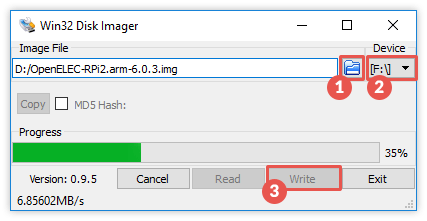 Starte den Disk Imager, wähle die OpenELEC Image-Datei aus und wähle den Laufwerksbuchstaben deiner SD-Karte aus. Drücke anschließend auf „Write“, bestätige die darauf kommende Warnmeldung mit „Yes“ und warte bis der Kopiervorgang abgeschlossen wurde.