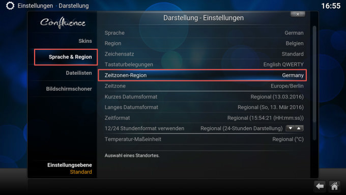Im selben Menü wo wir die Sprache geändert haben, stellen wir jetzt auch gleich die richtige Zeitzone ein, damit die Uhrzeit richtig angezeigt wird.