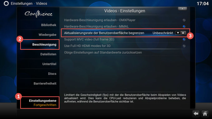 Stellen wir diese Limitierung also einfach ab. Unter Optionen → Video → Beschleunigung → Aktualisierung der Benutzeroberfläche begrenzenwählen wir „unbeschränkt“ aus. Damit du diesen Menüpunkt siehst, musst du wie im Screenshot zu sehen unter Punkt 1, die Einstellungsebene auf „Fortgeschritten“ stellen.